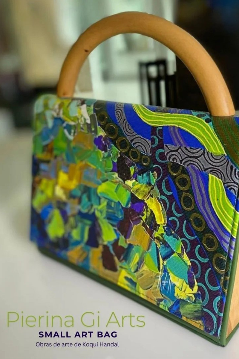 Su primera colección de carteras, fue un punto de partida que dejó claro el camino: exclusividad, belleza, técnica y significado. Se trataba de carteras intervenidas con obras de arte de Koqui Handal, certificadas y numeradas, con sello boliviano y calidad internacional.