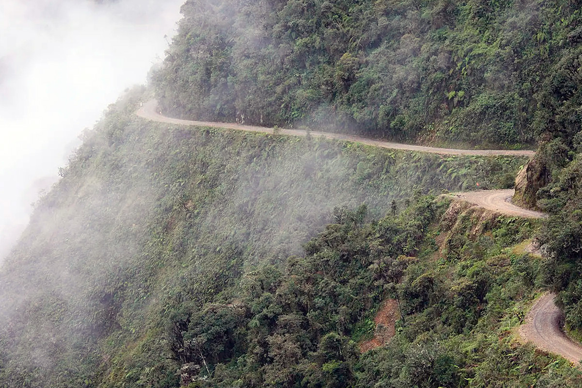 Declarada en 1995 por el Banco Interamericano de Desarrollo como la carretera más peligrosa del mundo debido a sus precipicios, curvas cerradas y condiciones climáticas extremas, esta vía conecta La Paz con los Yungas.